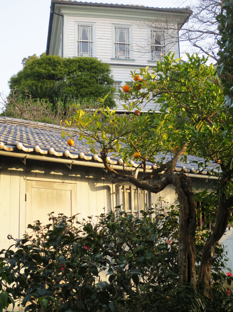 因長崎位於日本群島的最南方,其植物與京都、大阪、東京等地不同,主要百年老樹有: 樟樹、榕樹、羅漢松、鐵樹、青楓、山茶花等,僅少數庭院內引入北方的柏樹與黑松。